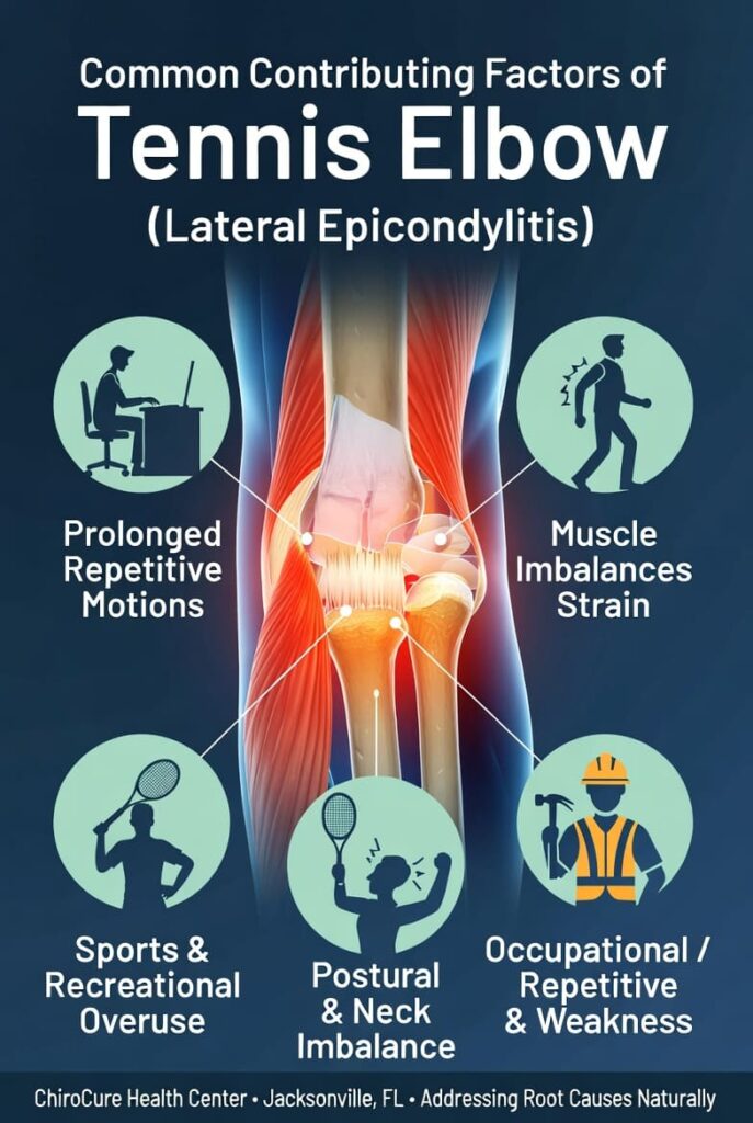 Other contributors include direct trauma, poor posture, or even cervical spine issues that refer pain to the arm. Research also shows that dysfunction in the cervical spine and upper back can contribute significantly to elbow symptoms because of nerve and muscle interconnections (Vicenzino et al., 2007).